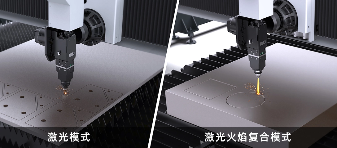 激光火焰复合和纯激光切割双模式快速切换,激光火焰复合模式,经济高效征服超厚碳钢板材,纯激光模式保障中薄板效率与精度。